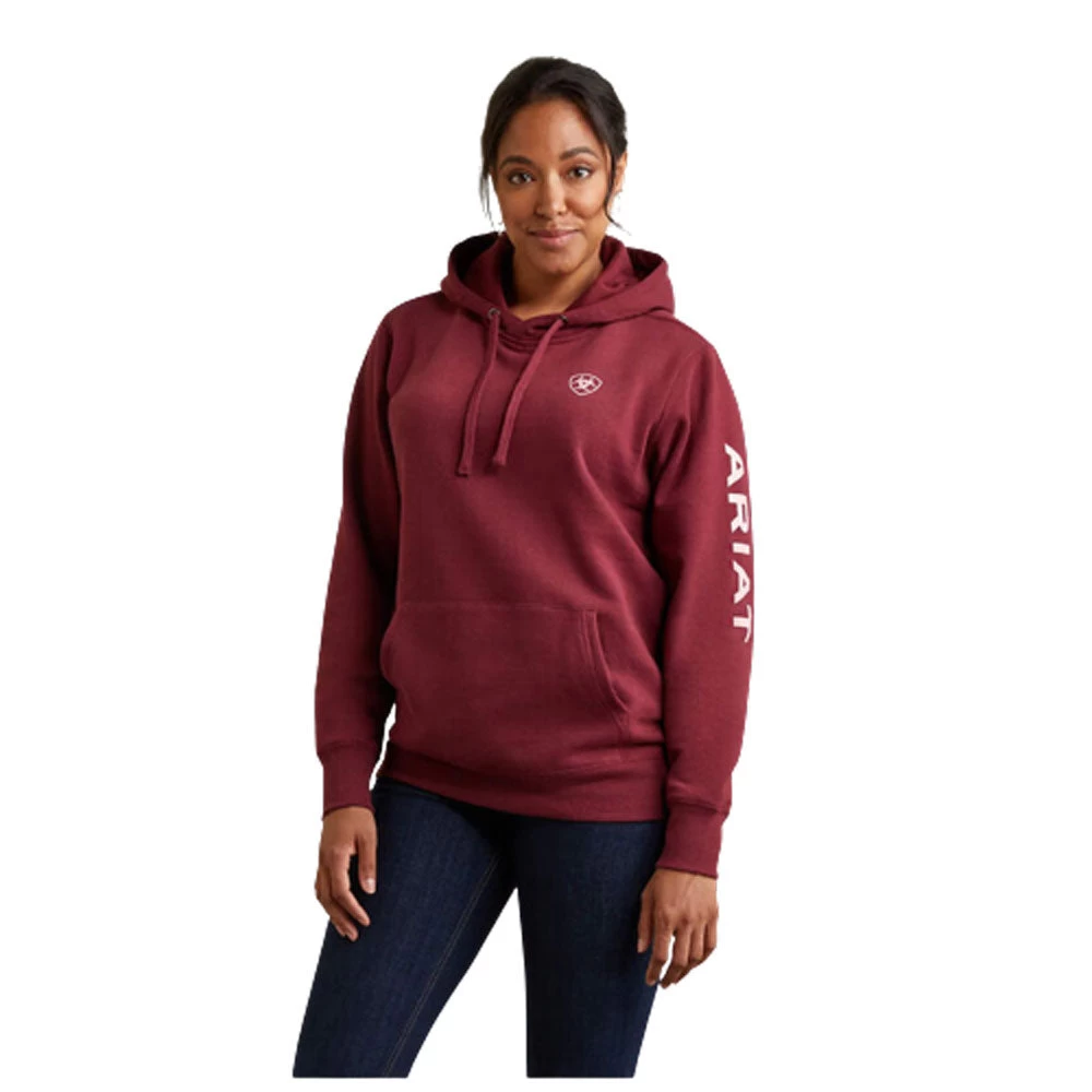 Ariat Women’s Logo Hoodie in Zinfandel. Ultra soft and comfortable, Ariat Hoodies are perfect for wherever you might take them. This one comes with a logo graphic down the sleeve.
