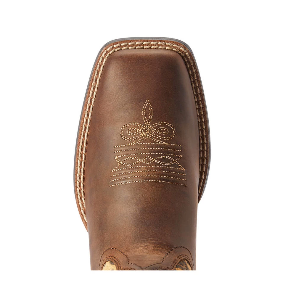 Wildly stylish ladies boot from Ariat! Round Up Crossroads Wide Square Toe Western Boot – Distressed Tan/ Sparkle Leopard.