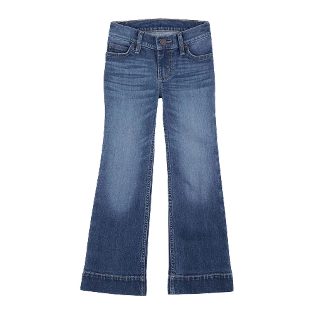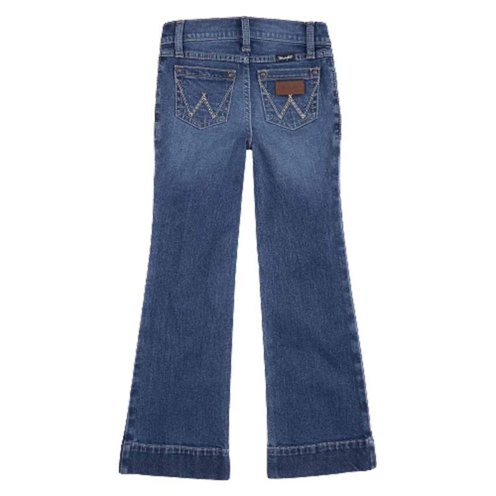 Wrangler girls medium wash jeans with a trouser leg and a โWโ embroidery on the open back pockets.