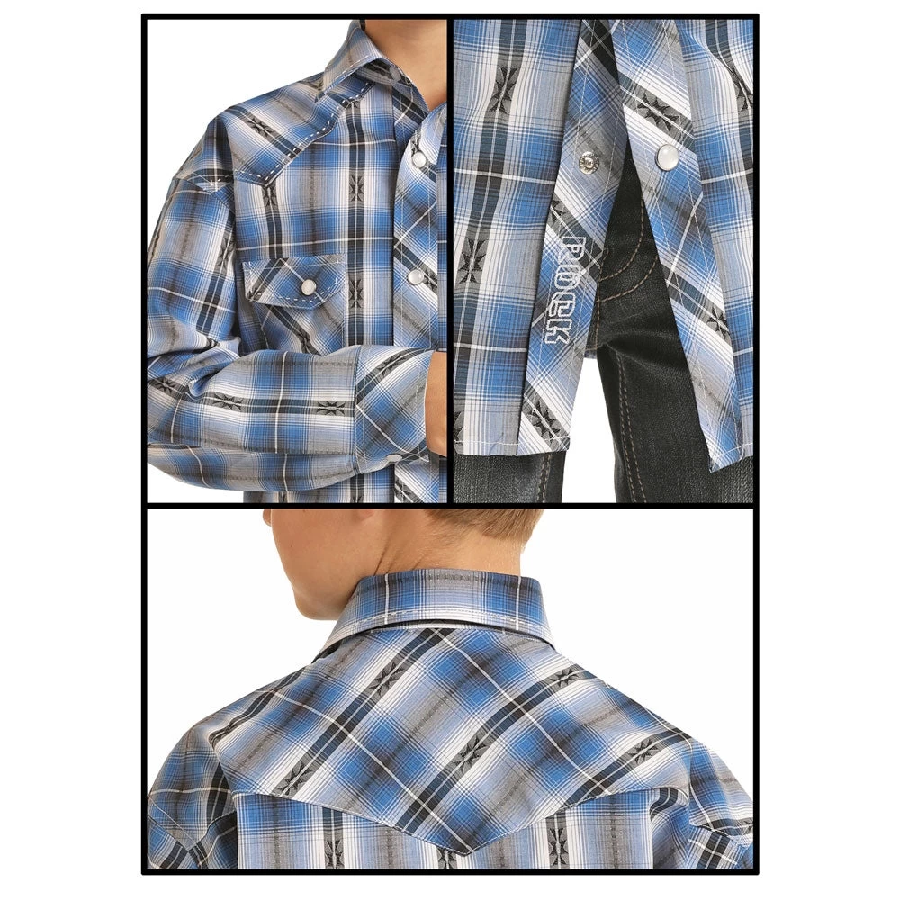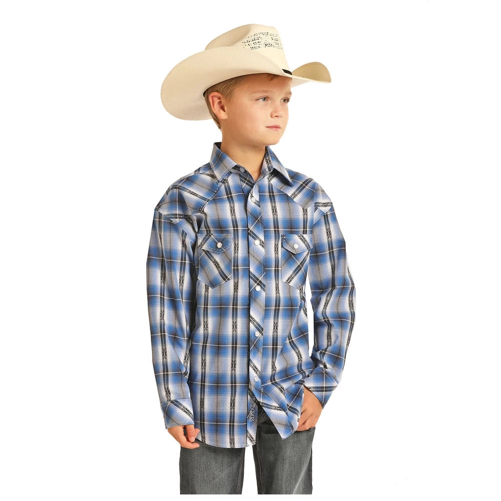 Rock & Roll Cowboy Boys Blue Dobby Plaid Long Sleeve Snap Shirt
