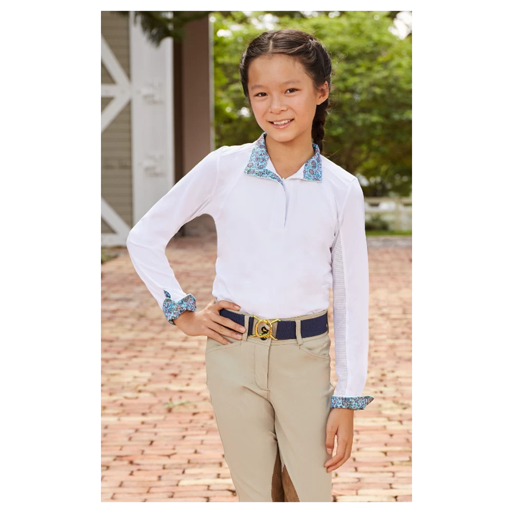 Girls Pull over shirt with zipper placket with printed trim on interior collar and cuffs