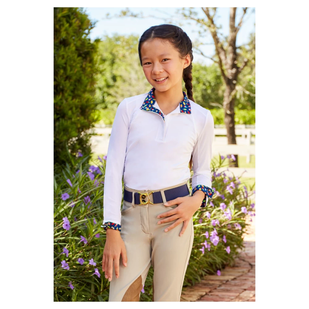 Girls Pull over shirt with zipper placket with printed trim on interior collar and cuffs