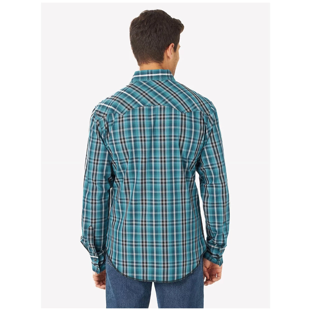 Wrangler Men’s Long Sleeve Turquoise, White and Black Plaid Western Snap Shirt