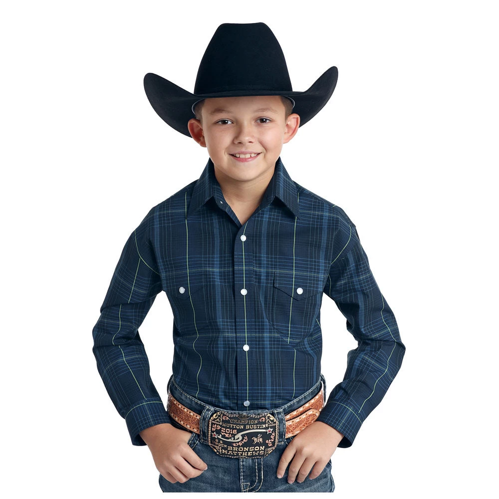 Boys’ navy plaid Western snap shirt from Panhandle.