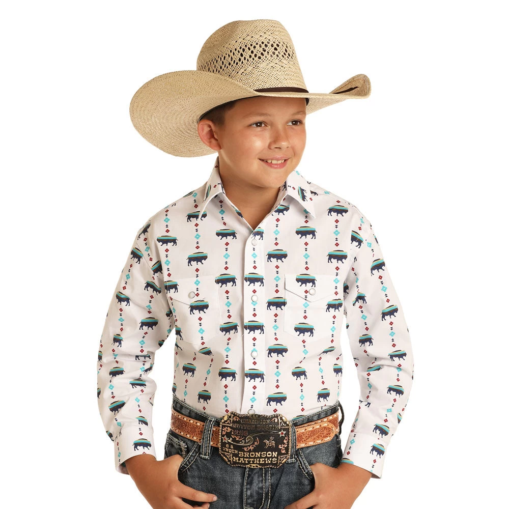 Panhandle Boys Long Sleeve Buffalo Print Western Snap Shirt