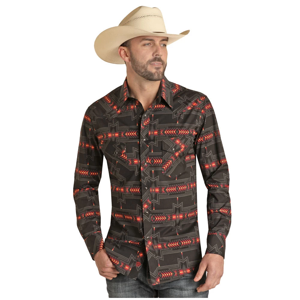 Be stylish and comfortable in this Rock & Roll Denim Mens’ Long Sleeve Snap Shirt in a Black & Orange Aztec Print.