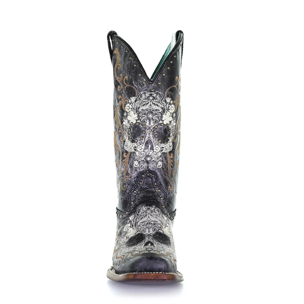 Corral Women’s Black and White Floral Skull Embroidery Studs Square Toe Western Cowboy Boots